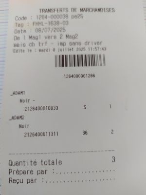 2 15:00:49 Information Transfert Mise à jour de transfert : 3 15:00:49 Information Transfert Mise à jour du transfert 1233-000009 dans la collection h20 4 15:00:49 Information Transfert Modèle(s) en reliquat de commande : 5 15:00:49 Alerte Transfert _TEST3 Beige 38 quantité en commande : 1 6 15:00:49 Information Transfert Modèle(s) en surplus de réception dans le bon : 7 15:00:49 Alerte Transfert _TEST3 Beige 35 quantité en plus : 1 8 15:00:49 Alerte Transfert _TEST3 Noir 38 quantité en plus : 1 9 15:00:49 Information Transfert Modèle(s) existant dans aucun bon : 10 15:00:49 Alerte Transfert _TEST2 TVARED Noir 38 quantité demandé : 1, Mag 3 -> Mag 1 11 15:00:49 Information Transfert Traitement terminé